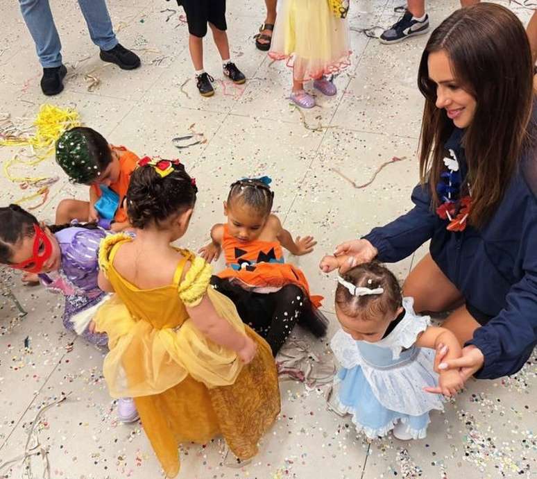 Para a folia, as pequenas ganharam produções caprichadas. A primogênita de Bruna, Mavie, de apenas 1 ano, surgiu fantasiada de Pedrita, a icônica personagem do desenho Os Flintstones. Já a pequena Mel encantou com um look azul e branco inspirado em Dorothy, do clássico O Mágico de Oz.