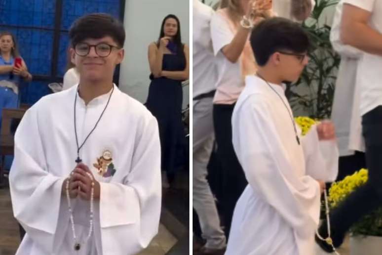 Nos registros, Bernardo Araújo aparece usando uma tradicional túnica branca, ajoelhado no altar da igreja, com um terço na mão e, em outro momento da cerimônia, recebendo a hóstia. No feed de comentários, admiradores deixaram mensagens. “A cara do pai”, disse um usuário do Instagram. “Lindo igual ao pai”, comentou outra. “É o Cris todin”, escreveu um internauta, referindo-se também a Cristiano.