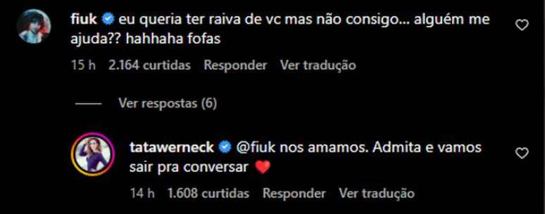 Fiuk brinca que 'queria ter raiva' de Tatá Werneck e humorista responde: 'Vamos sair para conversar'