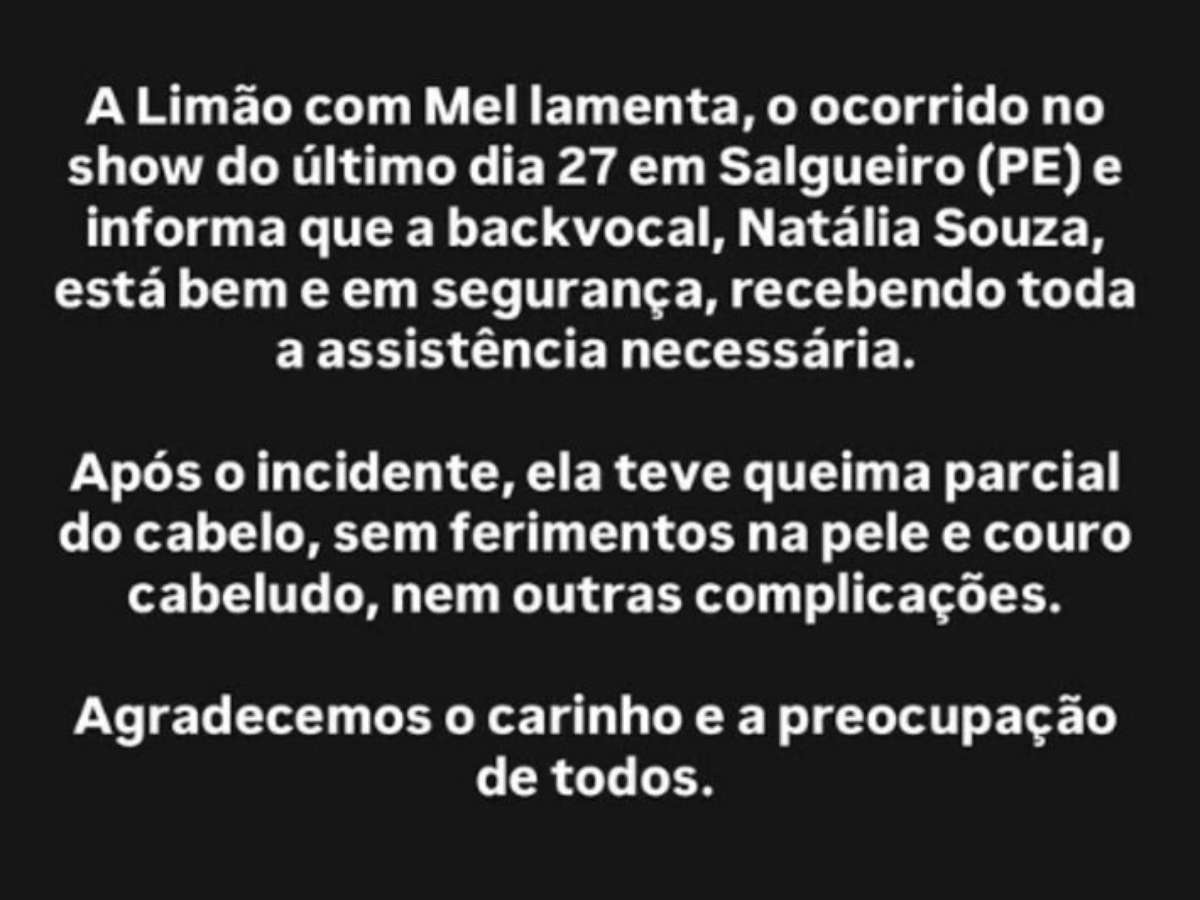 "A Limão com Mel lamenta o ocorrido no show do último dia 27 em Salgueiro (PE) e informa que a backing vocal Natália Souza está bem e em segurança, recebendo toda a assistência necessária. Após o incidente, ela teve queima parcial do cabelo, sem ferimentos na pele e couro cabeludo, nem outras complicações", diz a nota.