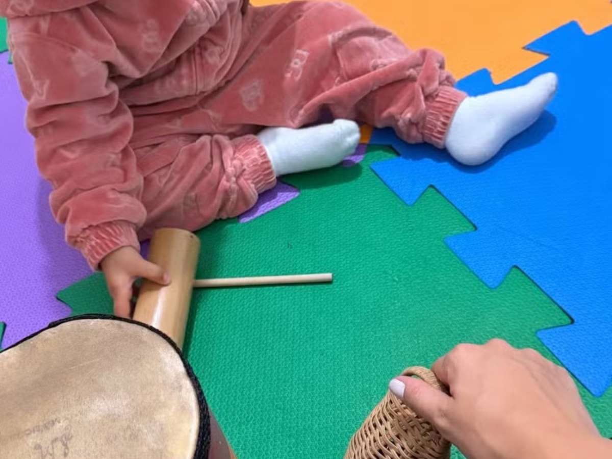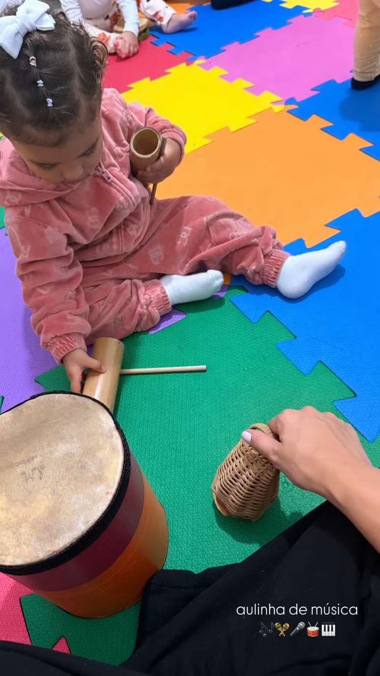 Atenta à atividade, a menina se divertia com dois tubos de bambu e baquetas — nas aulas de música para bebês, os educadores utilizam instrumentos, brinquedos, chocalhos, sinos e outros itens para desenvolver as dinâmicas. Bruna, que registrou o momento, segurava um chocalho.