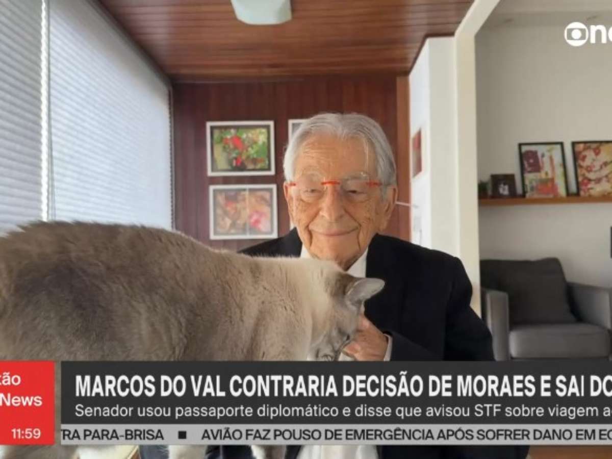 Enquanto Leilane Neubarth, Fernando Gabeira e outros dois comunicadores debatiam o caso do senador Marcos do Val (Podemos-ES), que viajou aos EUA contrariando determinação do ministro Alexandre de Moraes, do Supremo Tribunal Federal (STF), a gata, de nome Renata, surgiu na transmissão.