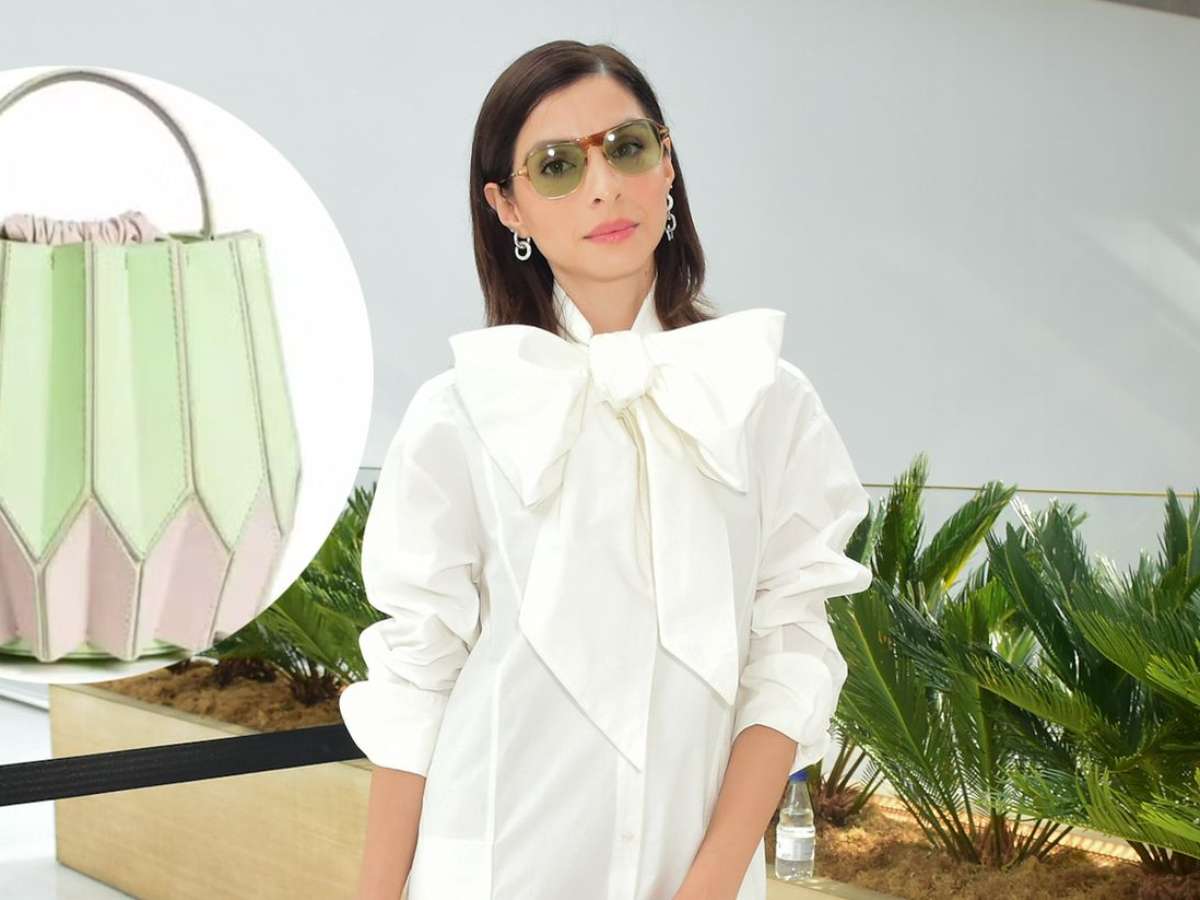 Giselle Batista combina look com bolsa inspirada em dobraduras do origami na SPFW; acessório de marca brasileira custa R$ 3,8 mil