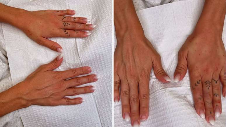 Nesta quarta-feira (16), ela compartilhou o passo a passo do procedimento estético que está fazendo, popularmente chamado de "harmonização das mãos". "Cheguei no lugar dos sonhos. Adivinha o que fiz? O procedimento mal começou (são três semanas para o resultado inicial) e já dá para ver a diferença", publicou ela, mostrando os bastidores.