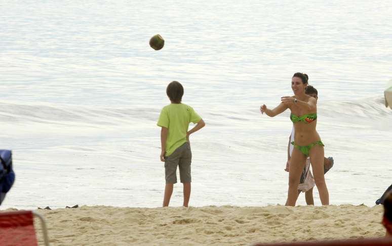 Glenda Kozlowski se divertiu atirando um coco na areia ao lado do filho mais novo, Eduardo, na tarde deste sábado (15), na praia de Ipanema, no Rio de Janeiro. Após a brincadeira, a apresentadora do Esporte Espetacular correu pela praia