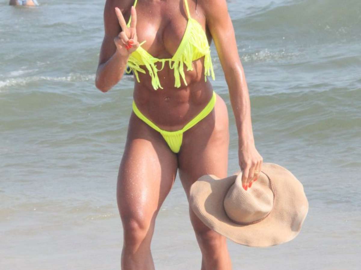 Gracyanne Barbosa, mulher do pagodeiro Belo, tirou o sábado (9) para curtir a praia. A rainha de bateria da Mangueira aproveitou o sol da Barra da Tijuca, no Rio de Janeiro, para reforçar o bronzeado e mergulhar no mar. Assediada por fãs, ela ainda tirou fotos e interagiu com os fotógrafos de plantão.