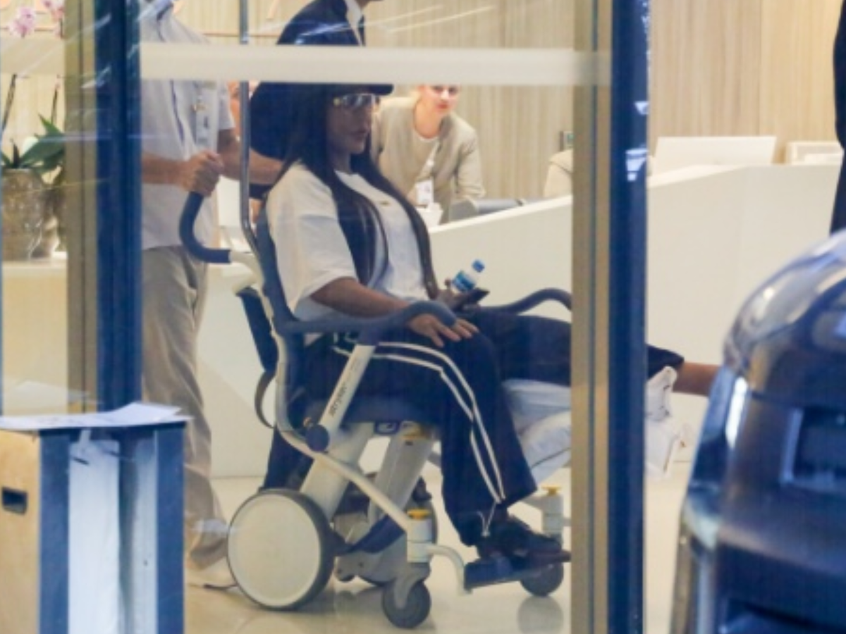 Nas fotos, a ex-BBB aparece com uma das pernas esticadas em um apoio enquanto é empurrada por funcionários do hospital em direção a um carro que a aguardava na entrada da unidade médica.