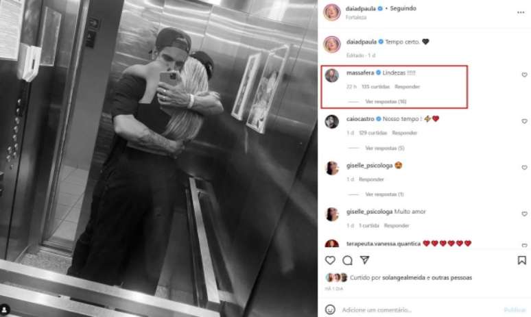 Na imagem, Caio e Daiana aparecem abraçados em um elevador e nos comentários a atriz comentou: "Lindezas". Daiane logo respondeu: "Você é luz".