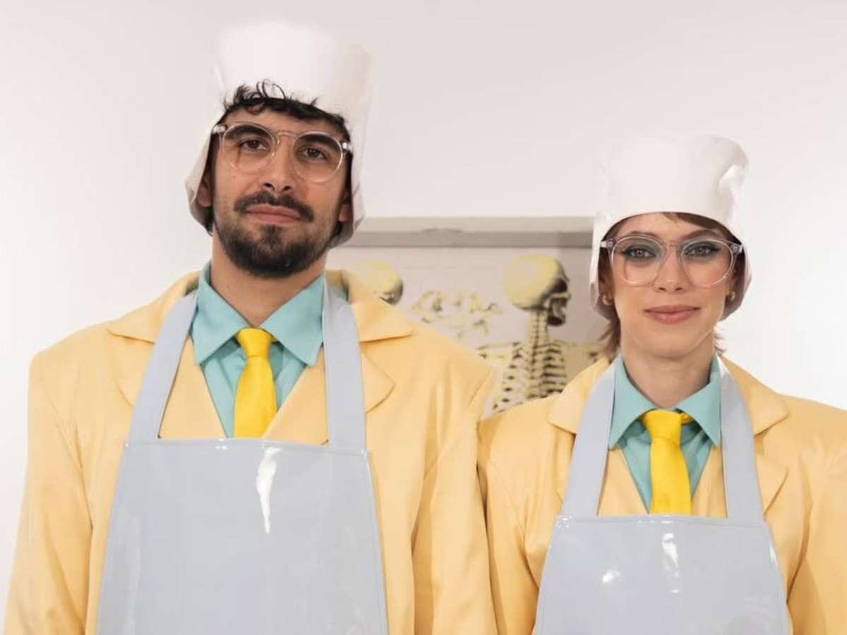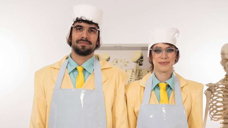 A influenciadora Mari Krüger e seu noivo escolheram fantasias inspiradas nos cientistas Tíbio e Perônio do Castelo Rá-Tim-Bum