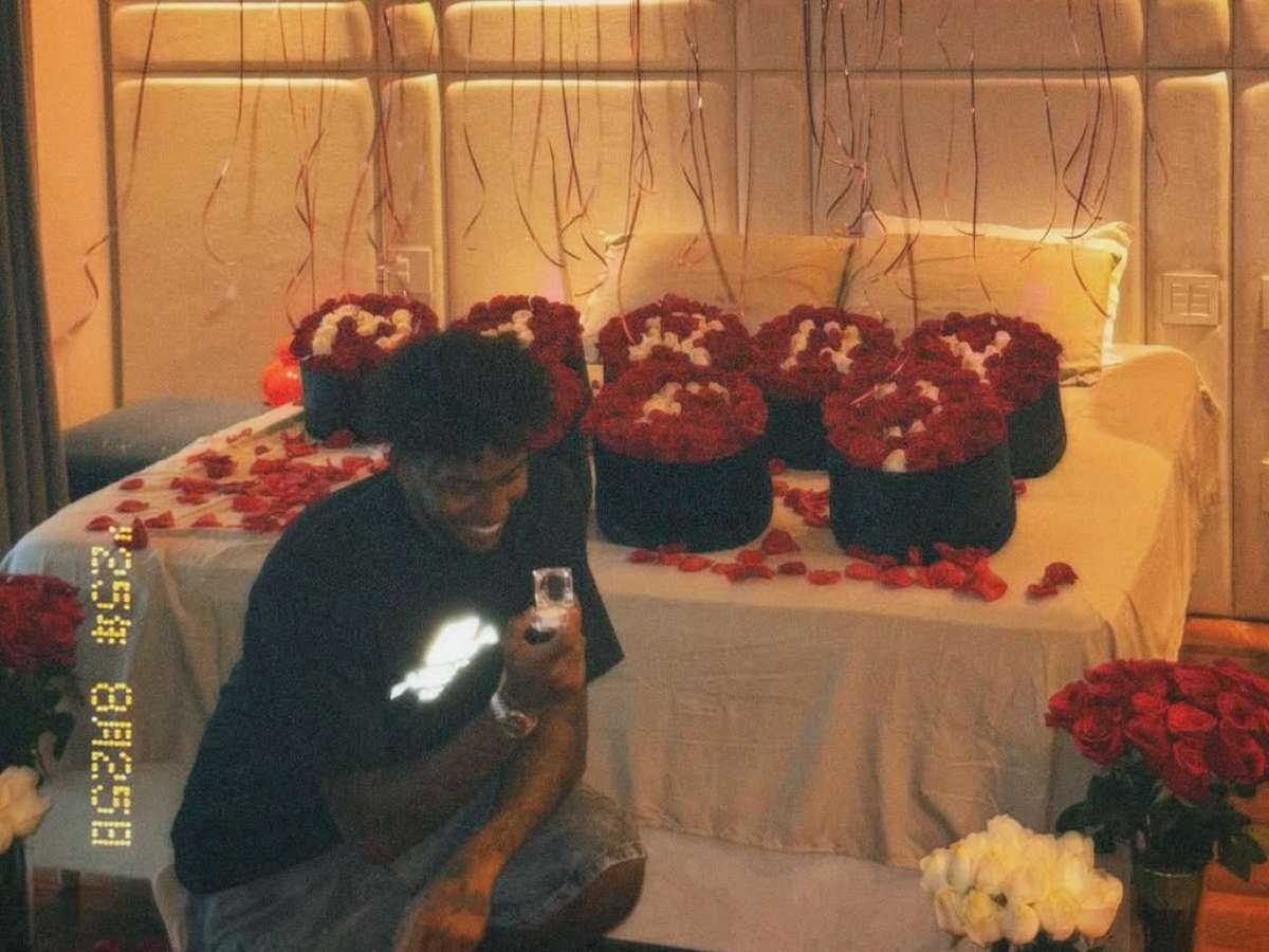 Em um quarto de hotel decorado com pétalas de rosas, balões vermelhos em formato de coração e uma cama coberta por buquês de flores, Hugo escreveu com rosas brancas a frase em inglês "marry me" (case comigo). "O começo de todos os sempres", escreveu a influenciadora em sua rede social.