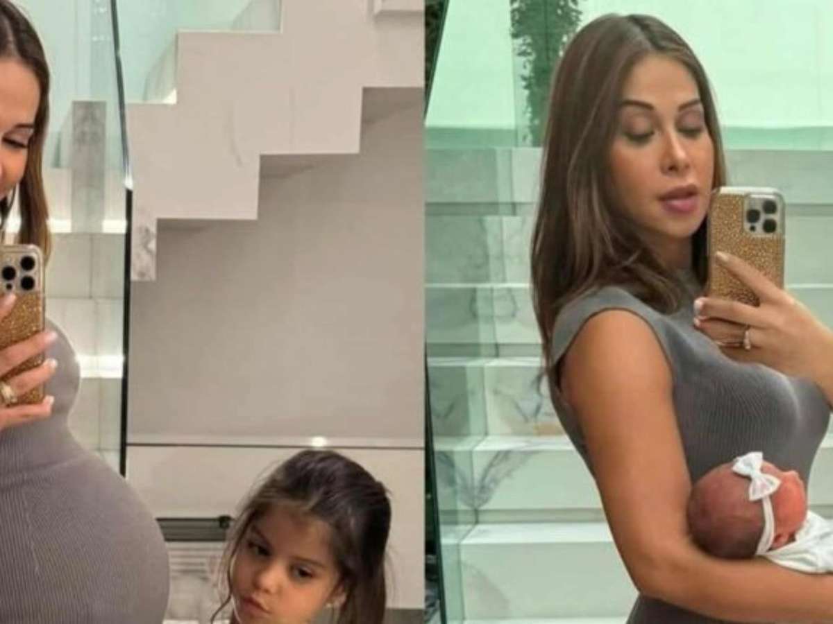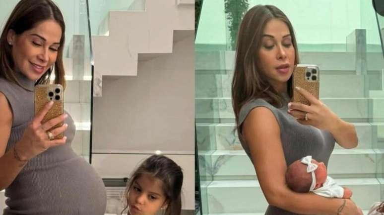 Nas imagens, Maíra aparece usando o mesmo vestido e posando ao lado da filha Sophia Cardi, fruto do relacionamento anterior com o ator Arthur Aguiar. Na primeira foto, ainda grávida; na segunda, já com a recém-nascida nos braços e uma barriga visivelmente diferente.