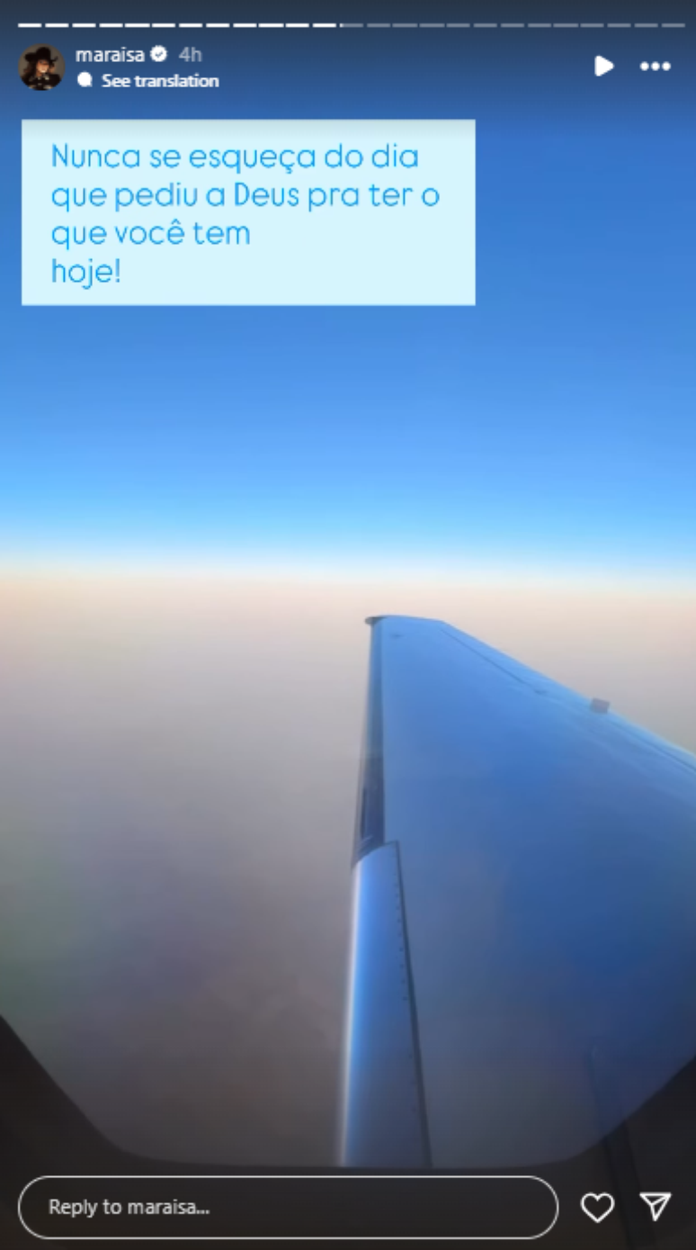 Nos stories, a irmã de Maiara apareceu embarcando em um jatinho particular após um show em Santa Bárbara de Goiás, exibindo semblante abatido. Logo depois, compartilhou uma foto do céu acompanhada da mensagem motivacional: "Não se esqueça do dia que pediu a Deus pra ter o que você tem hoje!".