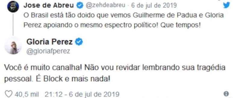 Glória Perez não perdoa a publicação feita por Zé de Abreu em julho nas redes sociais, quando o ator comparou o posicionamento político dela ao de Guilherme de Pádua, assassino da filha da escritora.