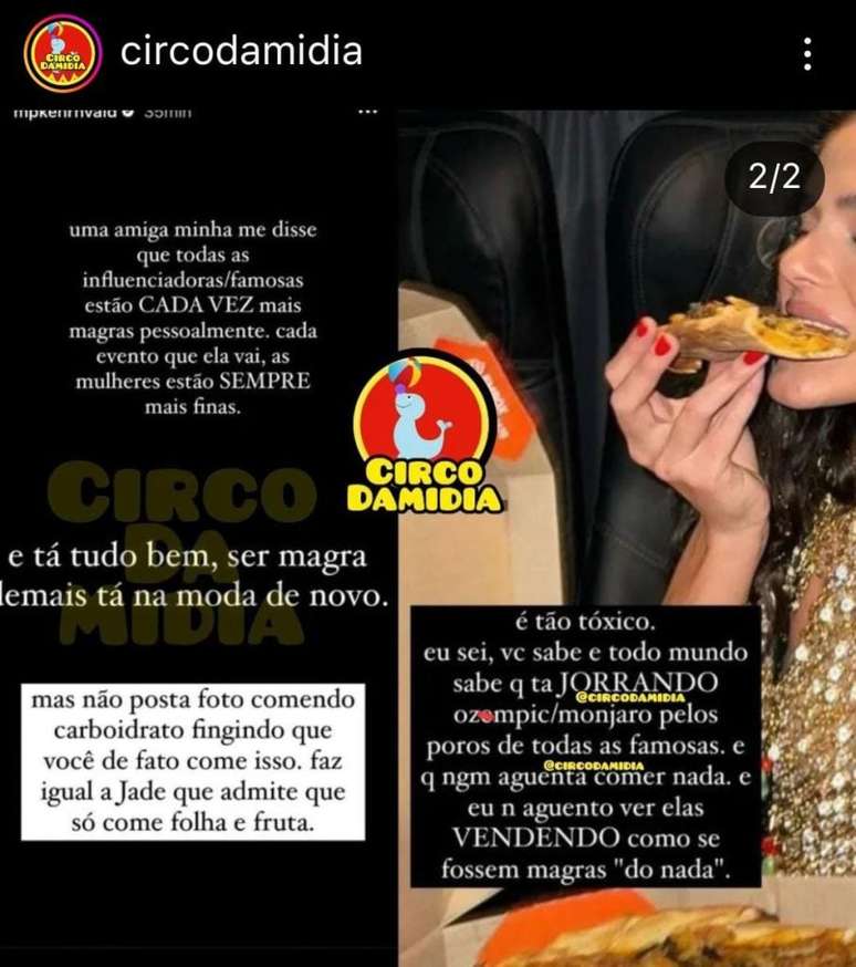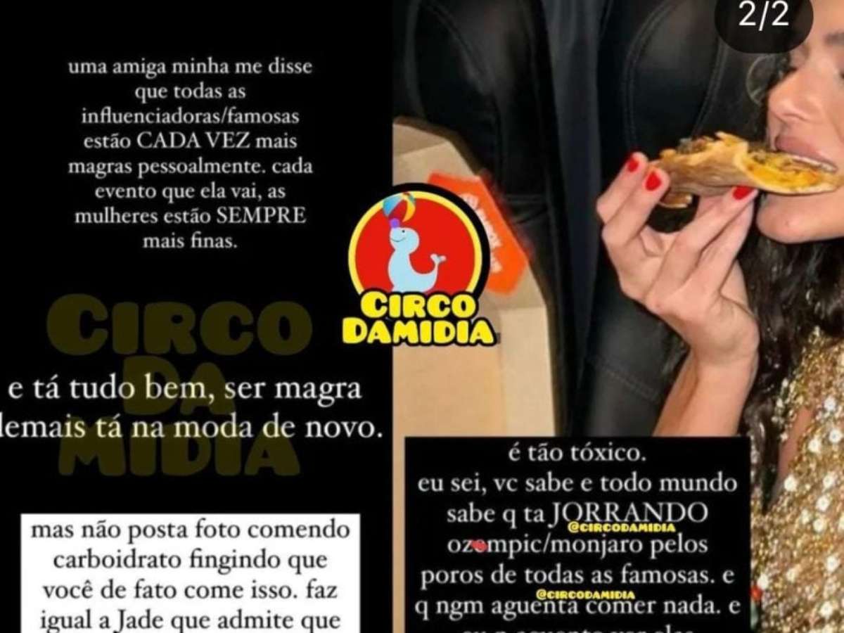 E continuou: "Mas não posta foto comento carboidrato fingindo que você de fato come isso. Faz igual a Jade [Picon] que admite que só come folha e fruta", declarou.