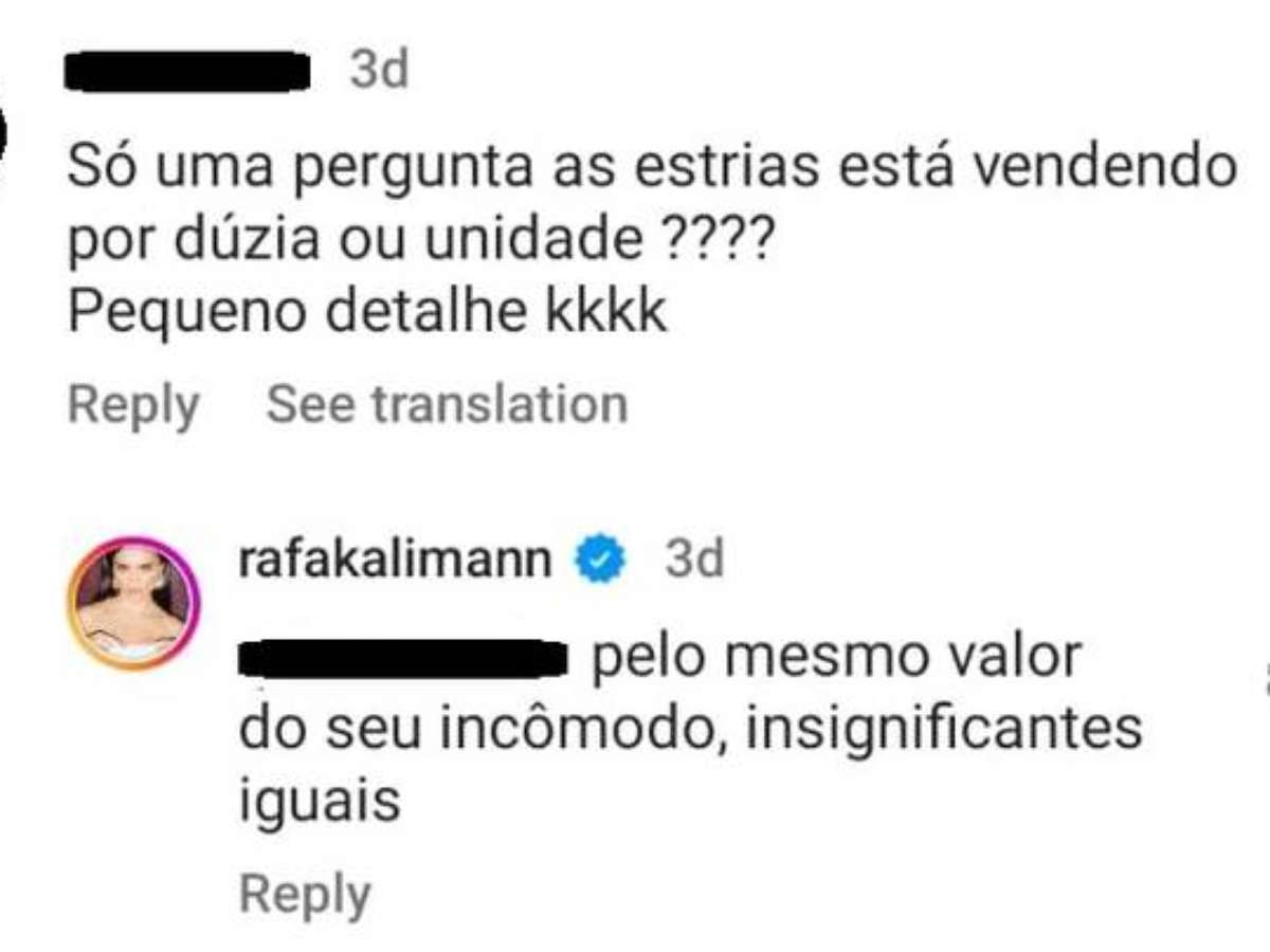 A apresentadora usava um vestido preto transparente que mostrava as suas peças íntimas e recebeu a seguinte mensagem: "Só por curiosidade, as estrias, está vendendo por dúzia ou por unidade? Pequeno detalhe". Em resposta, Rafa disse que o comentário era "insignificante". "Pelo mesmo valor do seu incômodo, insignificantes iguais."