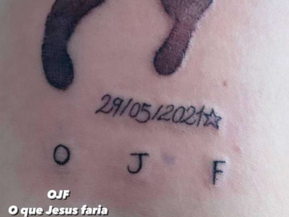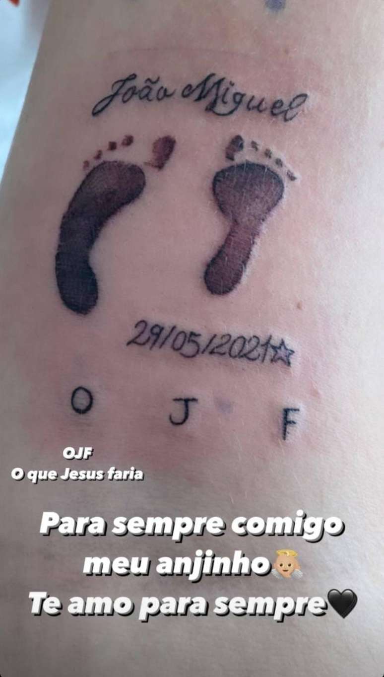 A tatuagem com o formato dos pés e o nome do bebê, também leva as iniciais OJF, que Hagda explicou significar: O que Jesus faria. Na legenda da foto postada ela escreveu: "Para sempre comigo meu anjinho. Te amo para sempre".