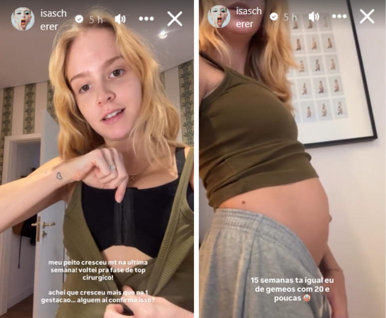 Isa aproveitou o momento para também mostrar sua barriga. Ela está grávida há 15 semanas e, segundo ela, a barriga está similar a quando estava de 20 semanas dos gêmeos. "Chocada", disse.