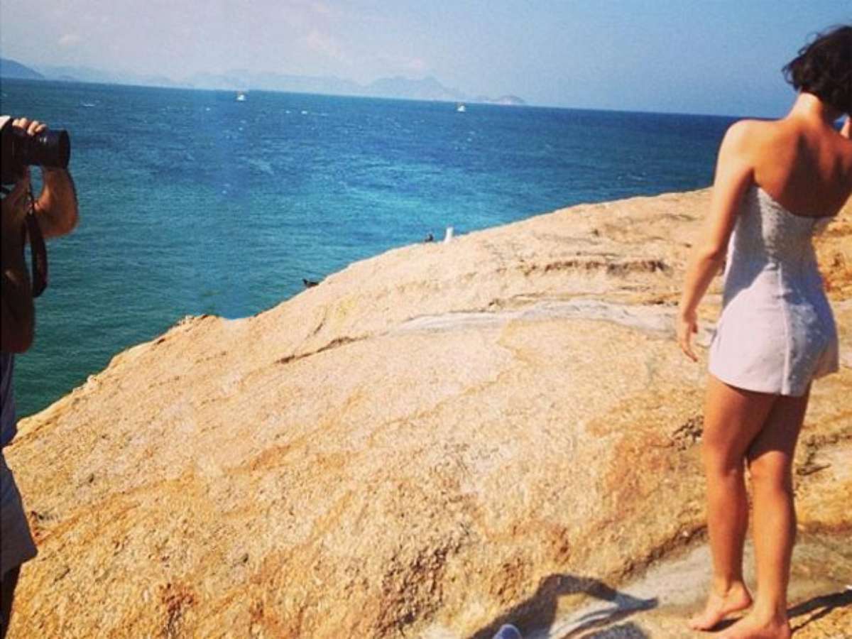 A atriz Isabelle Drummond utilizou seu perfil no Instagram na tarde desta segunda-feira (8) para postar uma foto do momento em que posava para um ensaio fotográfico na pedra do Arpoador, na zona sul do Rio de Janeiro. A modelo será capa da revista Glamour do mês de agosto.