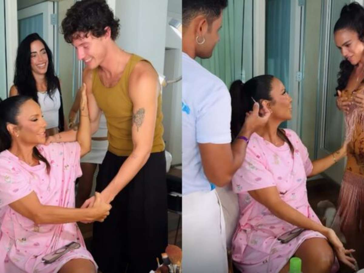 Shawn Mendes também aparece cumprimentando Ivete enquanto ela se preparava para subir no trio elétrico.