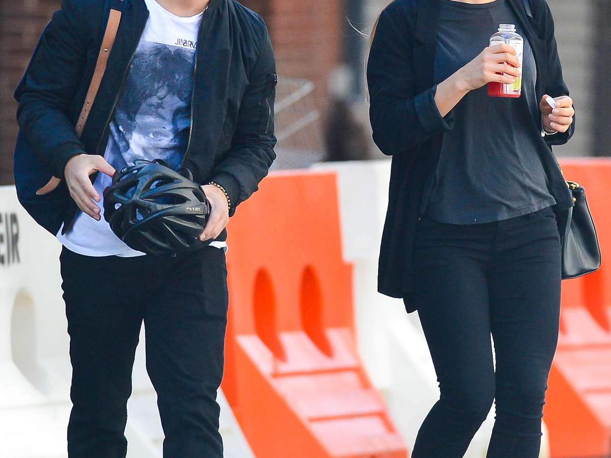 Joe Jonas foi fotografado durante um passeio com a namorada, Blanda Eggenschwile, em Nova York, nos Estados Unidos, na última quarta-feira (1º). Com visual despojado, o cantor do Jonas Brothers carregava um capacete de bicicleta nas mão, enquanto a amada tomava suco