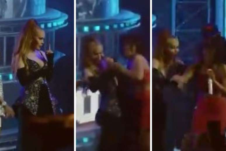 Assim que pegou o microfone de volta, Joelma deu algumas risadas. Enquanto isso, a plateia gritava: "Ih, fora!". A cantora, então, aproveitou a oportunidade para abraçar outra pessoa que estava no palco.