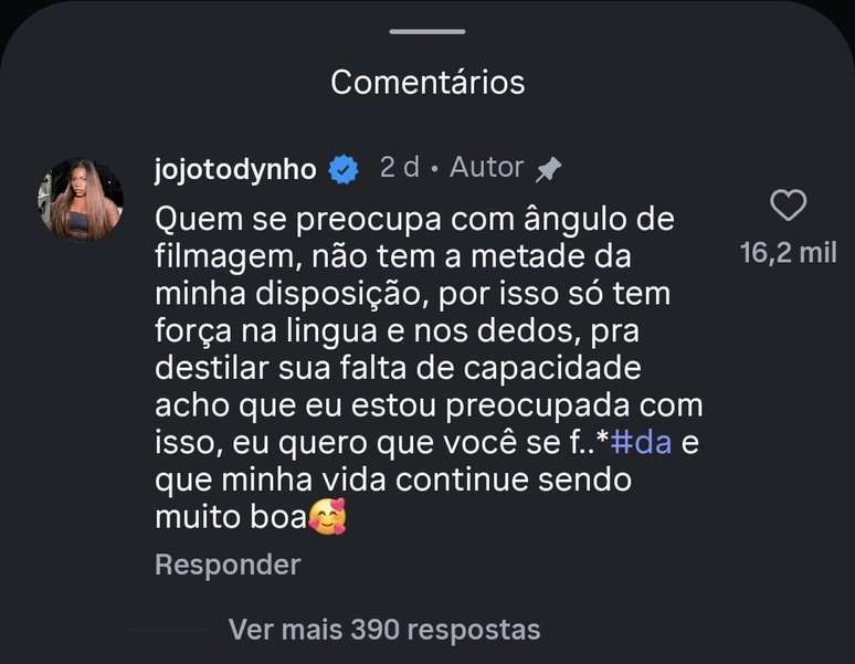 A reação veio rápido. Incomodada, Jojo decidiu responder publicamente e comentar o teor das mensagens recebidas.