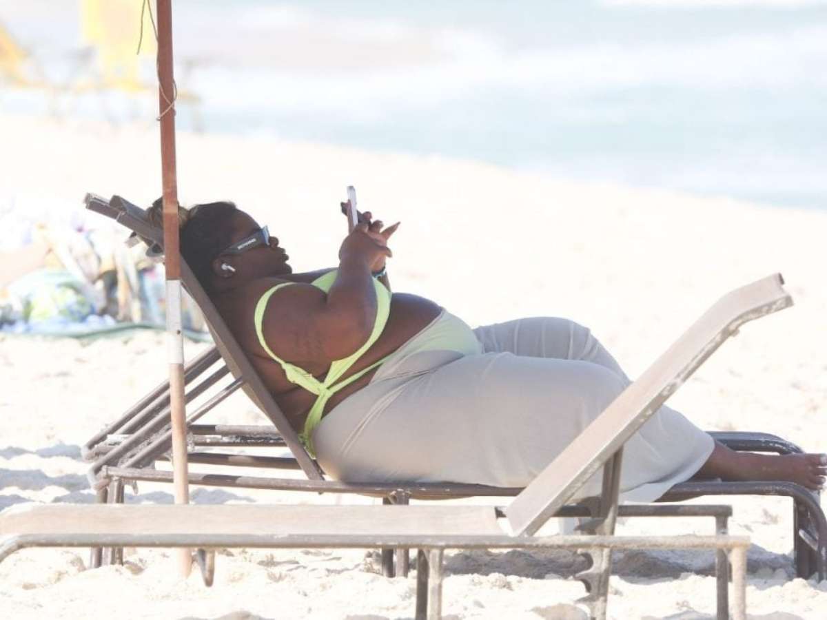 A cantora elegeu um biquíni neon, óculos escuros e ainda usou uma calça saída de praia transparente, enquanto descansava embaixo do guarda-sol.