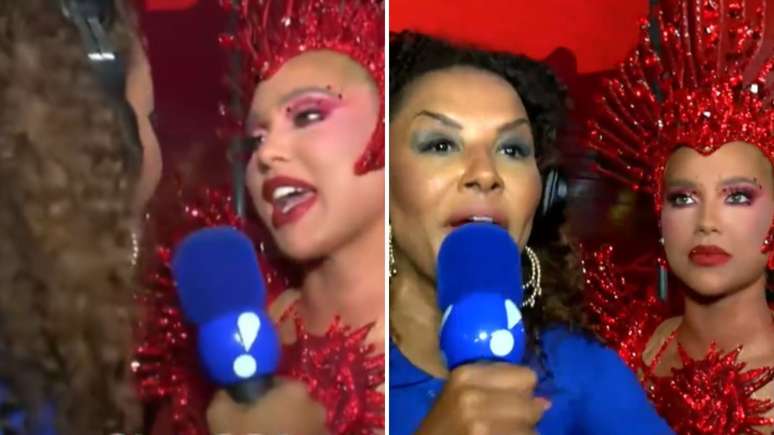 A entrevista aconteceu em meio à movimentação intensa nos bastidores, com a presença de integrantes da escola e da equipe de segurança. Em determinado momento, Jaider Soares, presidente de honra da Grande Rio, também apareceu e comentou a transmissão ao vivo. "De nada, minha filha. Só não pode falar que você estava apanhando", disse.