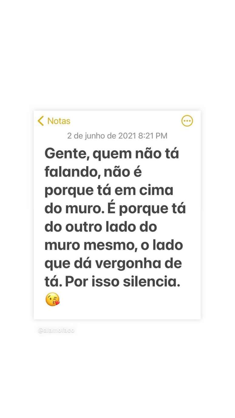 Para comprovar que o alvo era ela mesmo, Samantha Schmütz reagiu à mensagem de Juliana Paes. Também sem dizer o nome da atriz, ela escreveu em suas redes sociais: "Gente que não está falando, não é porque está em cima do muro. É porque está do outro lado do muro mesmo. O lado que dá vergonha de estar. Por isso silencia".
