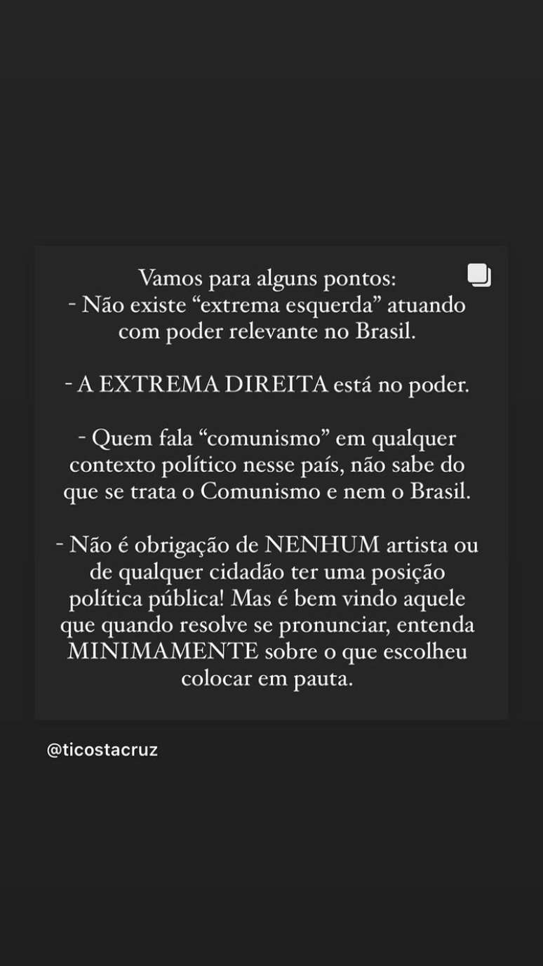 Samantha Schmütz ainda repostou uma mensagem do roqueiro Tico Santa Cruz abordando o argumento dos "comunistas" levantado pela atriz. Veja os posts das duas estrelas abaixo.