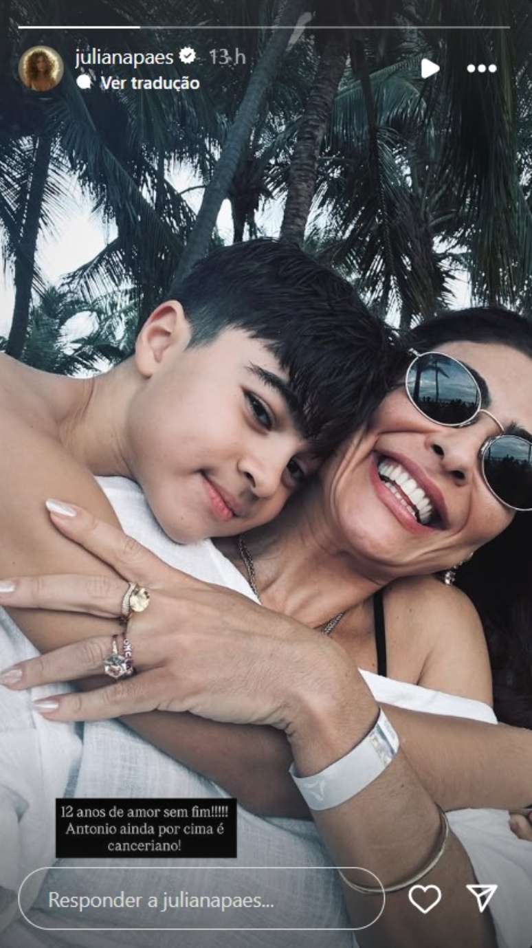 Discreta, ela compartilhou um registro raro ao lado do menino no story do Instagram, onde os dois aparecem abraçados. "12 anos de amor sem fim! Antônio ainda por cima é canceriano", brincou ela, dando a entender que a criança é sentimental.