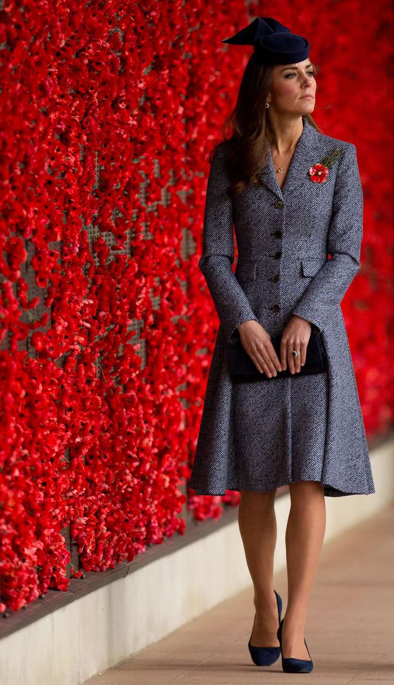 Kate visita o Australian War Memorial em 25 de abril de 2014 e mostra que até o sobretudo valoriza suas curvas