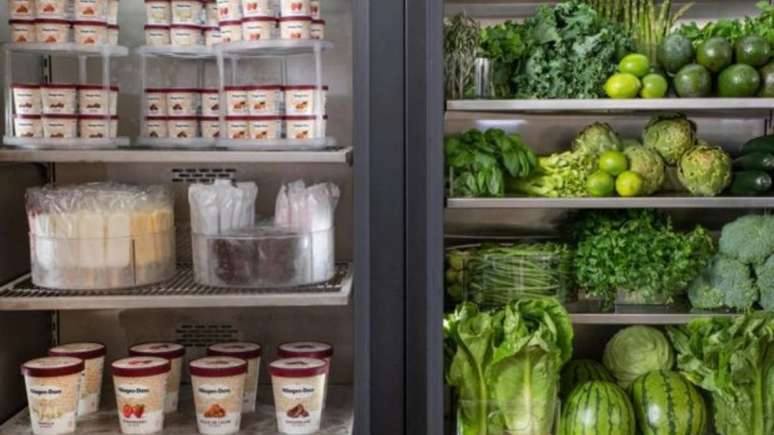 Na parte de dentro, é possível ver diversos alimentos saudáveis como ovos, folhas variadas, melancia, brócolis, morango, cereja e por aí vai... Como nem Kris é de ferro, na parte do freezer há um espaço reservado para potes de sorvete, incluindo aqueles bem chiques, da Disney, no formato do Mickey Mouse.