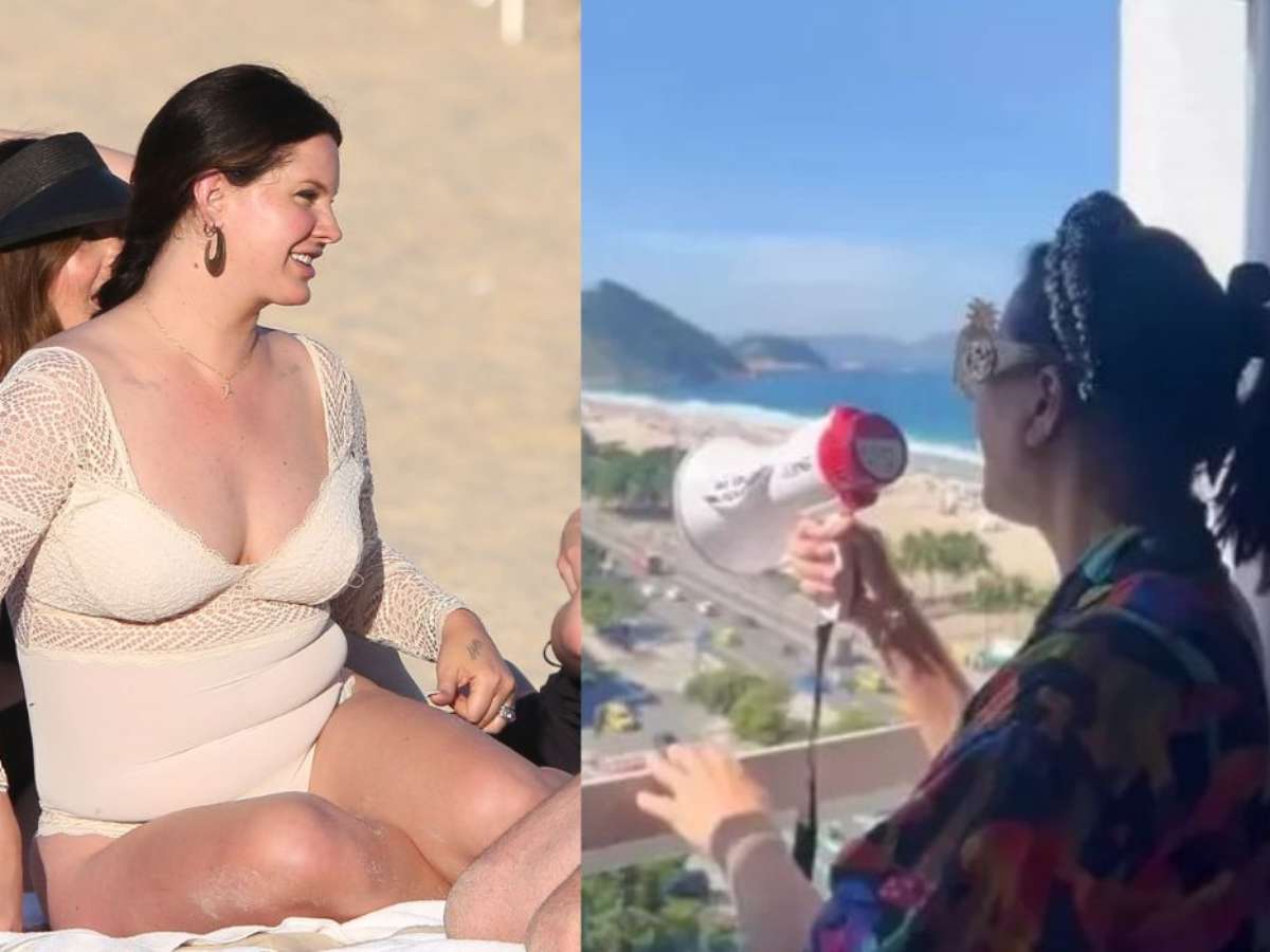 Lana Del Rey curte praia no Rio e Narcisa usa megafone para chamar atenção da cantora