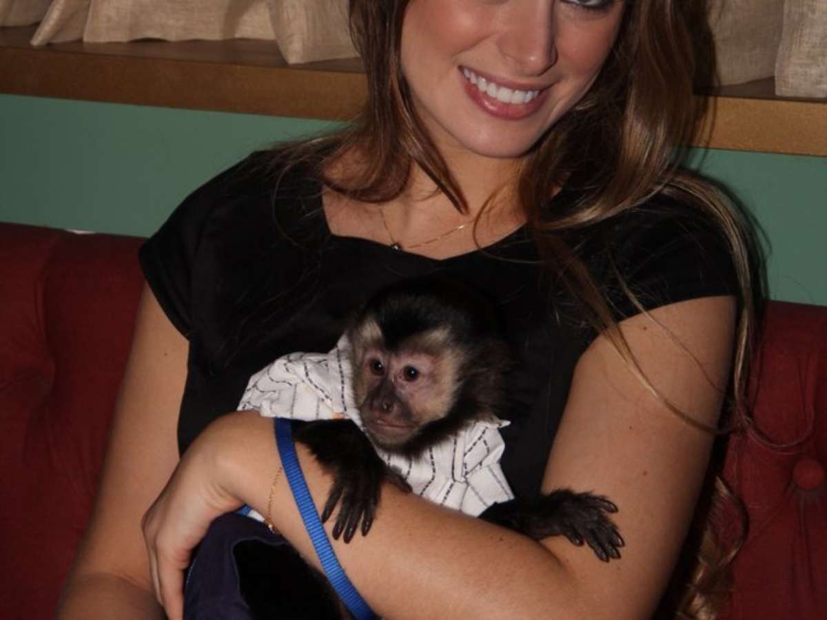 Sem desgrudar do bicho, ele posou para fotos com o aniversariante, e mesmo quando não estava com o macaquinho, o animal não ficou sem cuidados, Rayanne ficou com ele no colo e fez muitos carinhos.