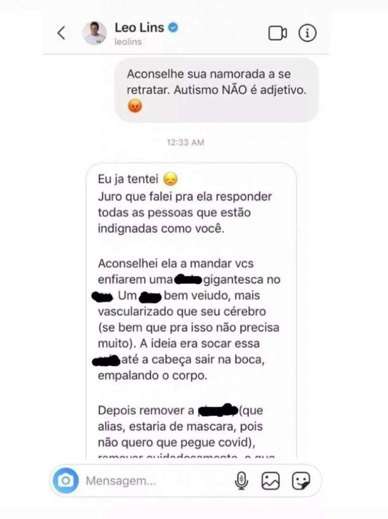 Apesar de reconhecer que, de fato, enviou a mensagem, Lins argumentou que ela seria direcionada para uma pessoa específica, não para a comunidade autista.