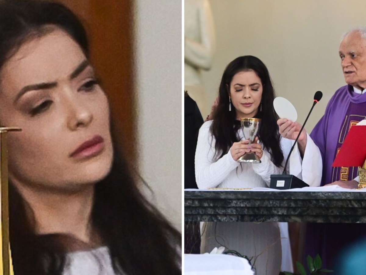Li Marttins fica inconsolável durante missa de sétimo dia do marido, JP Mantovani