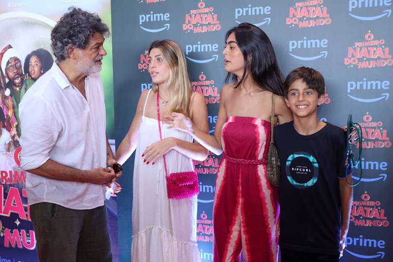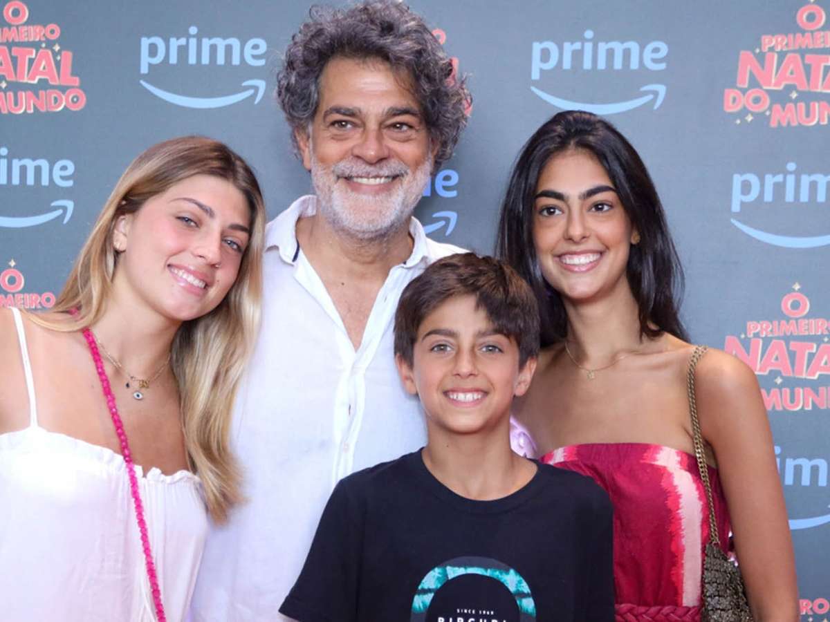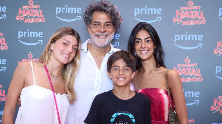 A família foi prestigiar o lançamento do filme O Primeiro Natal do Mundo em um cinema no Rio de Janeiro. O artista que vive o Rafael na trama que voltou a ser apresentada nas tardes da Globo posou sorridente e rodeado pelos filhos.