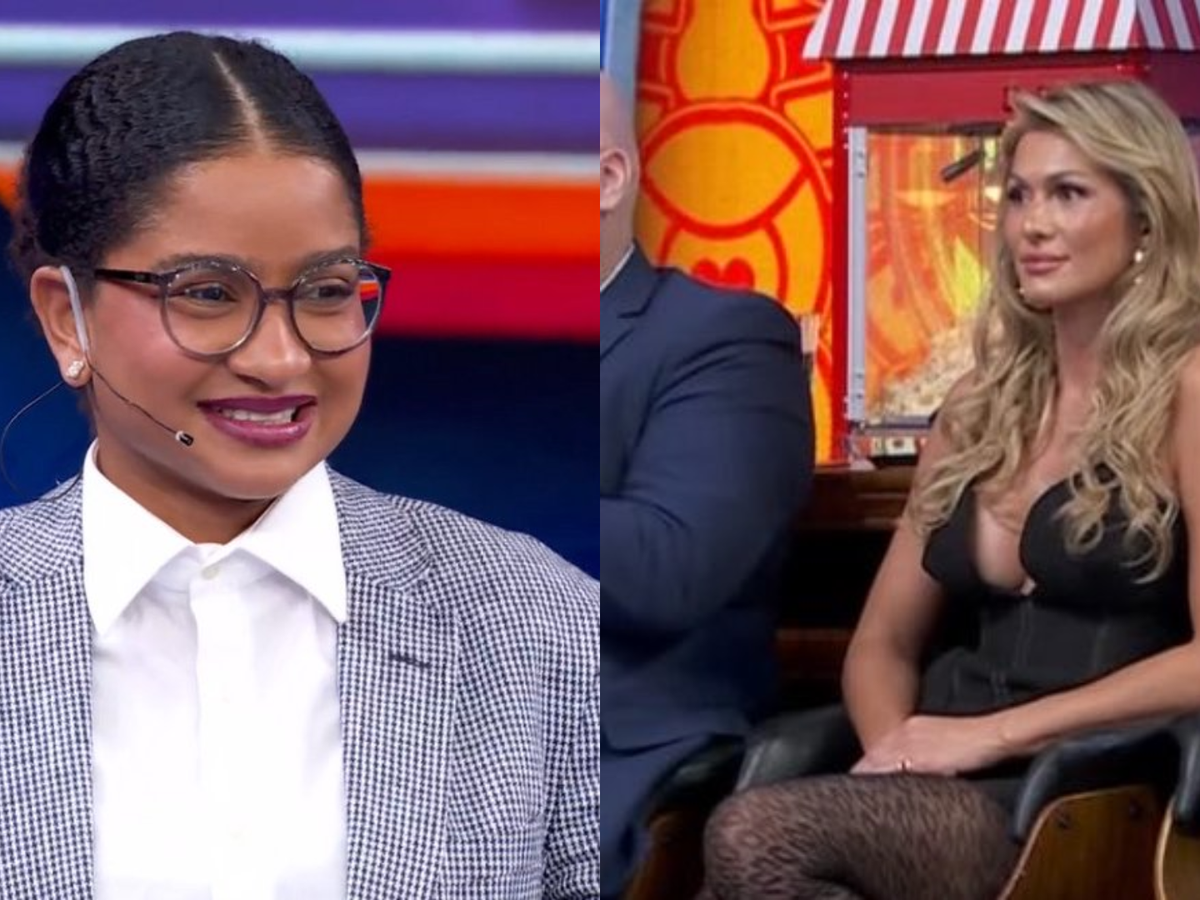 Lívia Andrade explica cara fechada para Milena no Domingão: 'Não sou obrigada a sorrir'