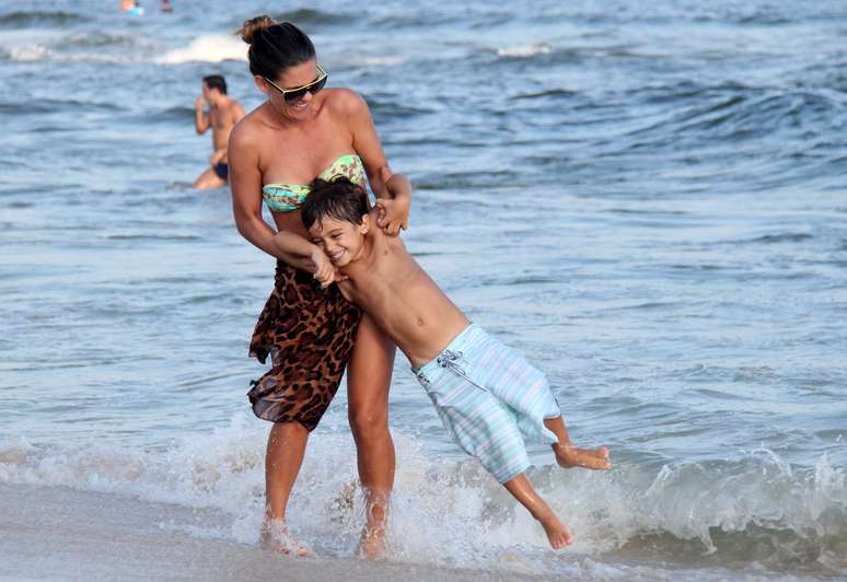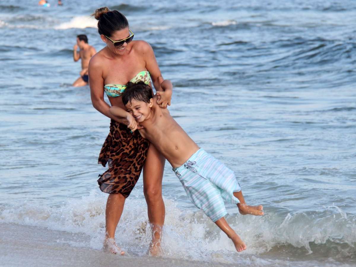 Lívia Lemos e o filho Gael, de 5 anos, aproveitaram o feriado do dia do trabalhador para se divertir na praia da Barra da Tijuca, no Rio. Os dois foram clicados brincando no mar carioca