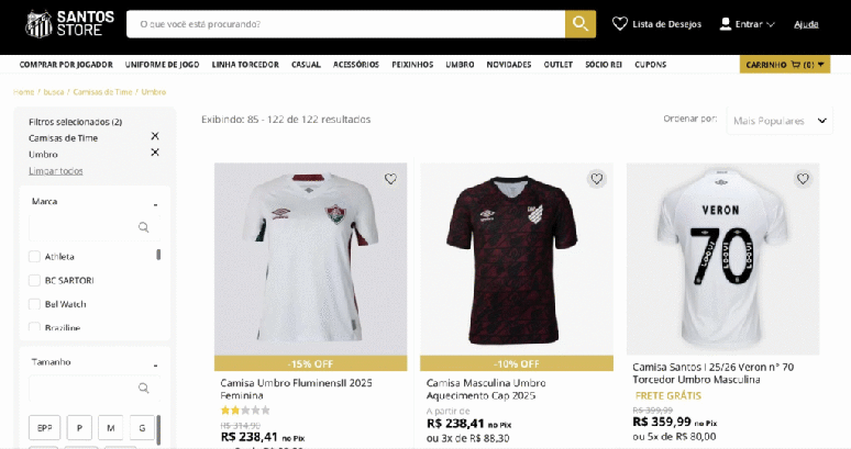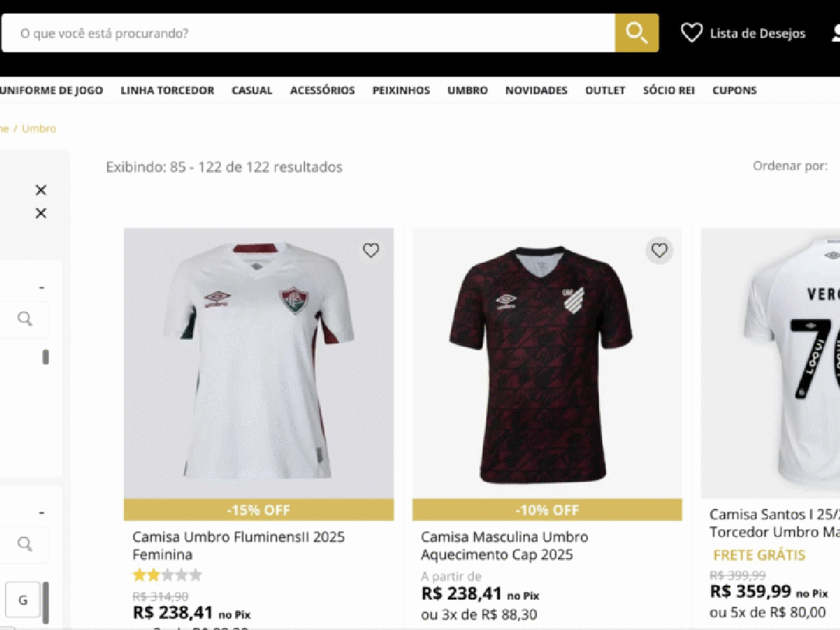 A Santos Store, plataforma oficial de vendas online do Santos, apresentou em sua vitrine digital camisas do Fluminense e do Athletico. A falha chamou atenção de torcedores nesta quinta-feira (07), provocando reações nas redes sociais, já que se trata da loja oficial de um dos clubes mais tradicionais do país.