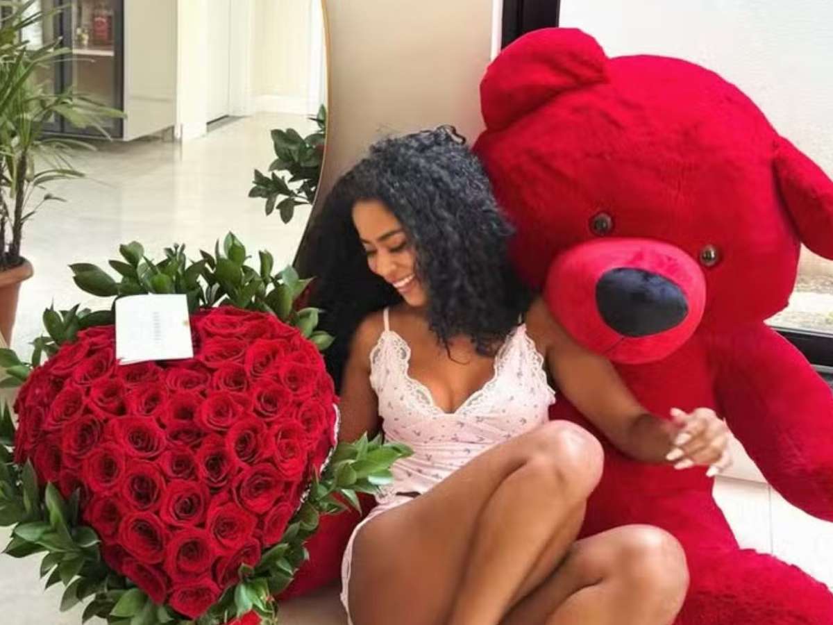 Lorena Maria compartilhou com seus seguidores um presente romântico que recebeu na manhã deste sábado (17). Nos cliques compartilhados no feed do Instagram, a influenciadora aparece sentada no chão, ao lado de um buquê de rosas vermelhas em formato de coração e um ursinho gigante da mesma cor.