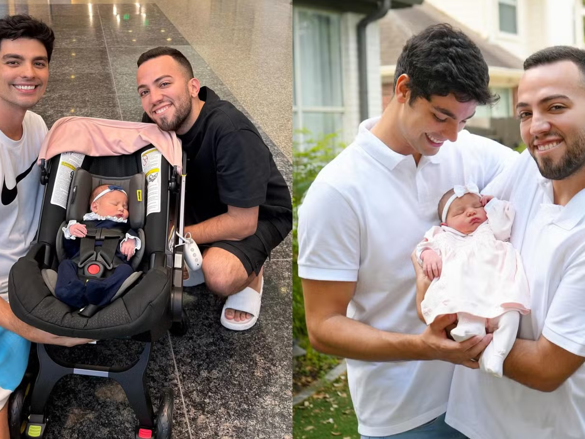 Casados desde 2024, Lucas Rangel e Lucas Bley apresentam a filha Mia, nascida de barriga solidária nos EUA