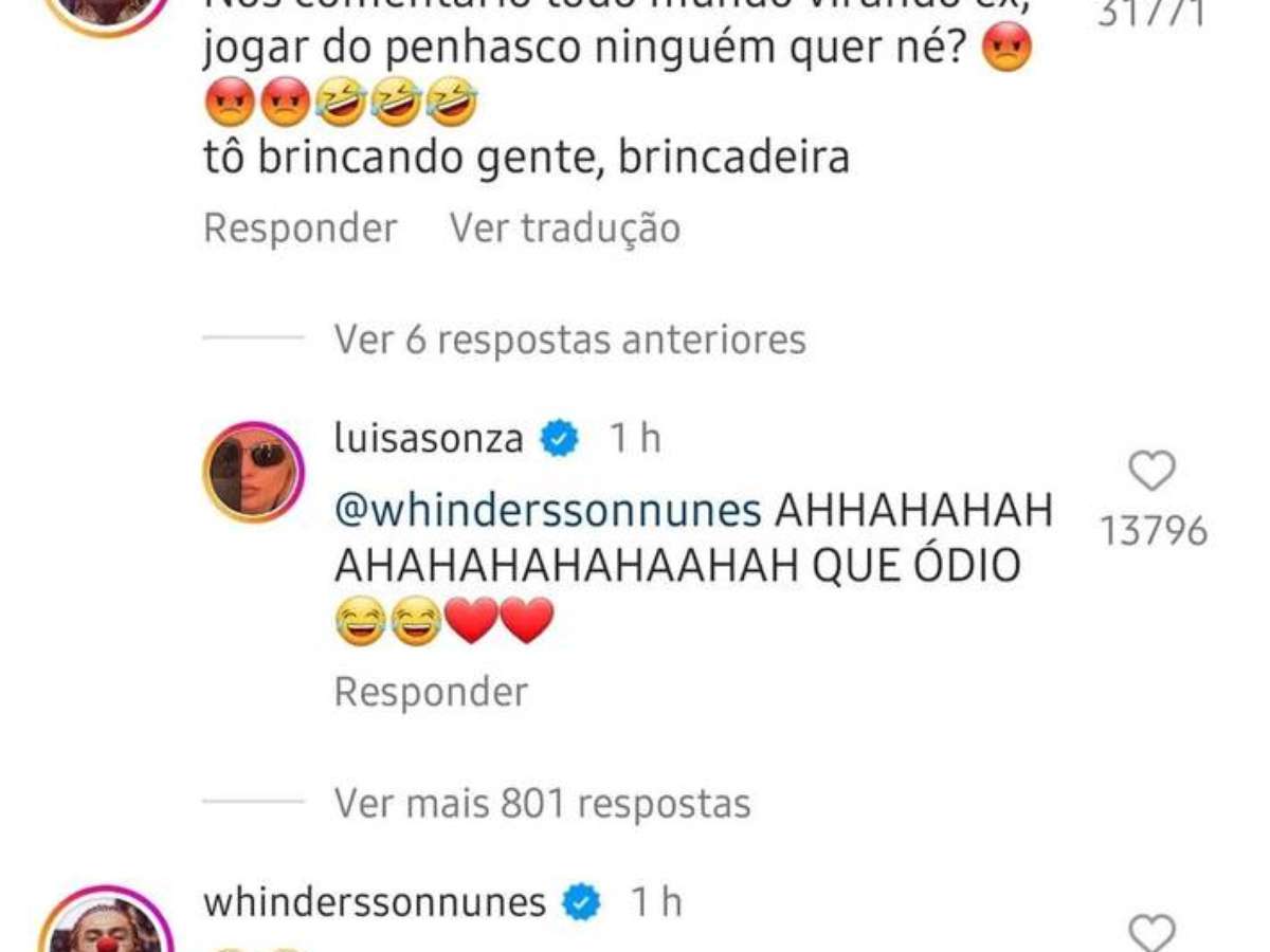 "Nos comentários todo mundo virando ex. [Se] jogar do penhasco ninguém quer né?", brincou. O comentário foi uma referência a canção Penhasco.