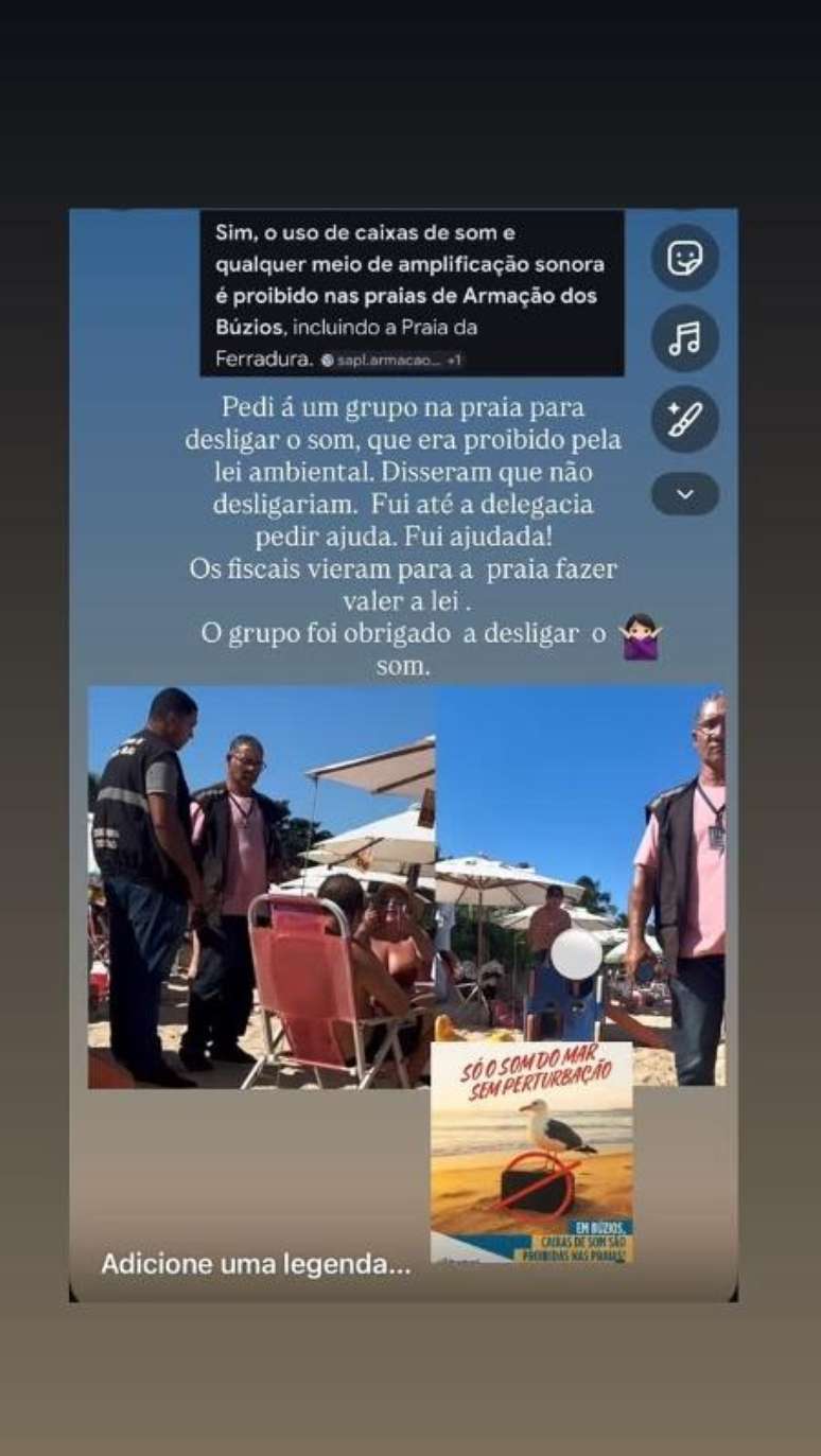 Em vídeos compartilhados por Luma de Oliveira, é possível ver agentes abordando pessoas que estavam no local. Em Armação dos Búzios, existe uma legislação municipal que proíbe o uso de caixas de som ou qualquer equipamento de amplificação sonora nas praias. A regra está prevista na lei nº 1.762, sancionada em 6 de julho de 2022. O objetivo da medida é preservar o ambiente natural e garantir mais tranquilidade aos frequentadores.