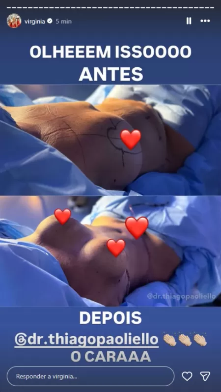 Segundo publicado, Margareth realizou abdominoplastia, cirurgia nas mamas e um procedimento estético no bumbum. Virginia também fez questão de agradecer a equipe responsável. "Obrigada Dr. Thiago e equipe. Não deixaria ela realizar esses procedimentos se não fosse com vocês."