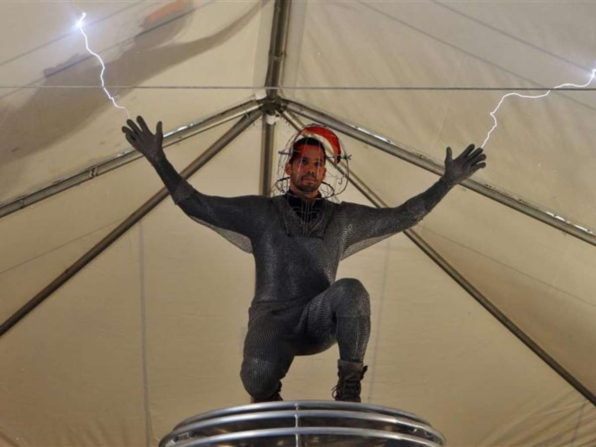 O mágico David Blaine subiu numa plataforma bamba em cima de uma poderosa bobina de Telsa, dentro de uma tenda em um píer de Manhattan, e, vestindo um traje feito com quase dez quilos de malha metálica, começou a disparar raios purpúreos pelas mãos e pela cabeça.