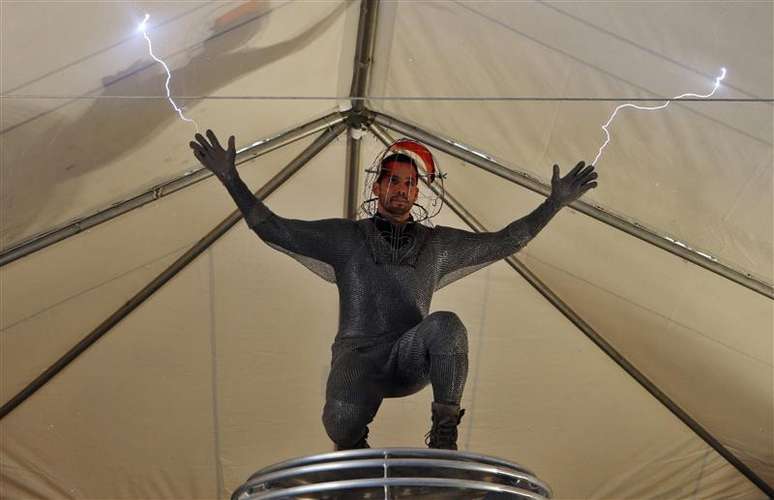 O evento --uma entrevista coletiva diferente, na terça-feira, na qual houve até um pedido aos jornalistas para que protegessem seus ouvidos com pedaços de espuma-- serviu para apresentar um truque que Blaine irá realizar a partir de sexta-feira, quando pretende passar 72 horas de pé sobre a plataforma de 6 metros de altura, sem comida, em meio a uma tempestade de relâmpagos artificiais emitidos por bobinas de Tesla com potencial elétrico de 1 milhão de volts, mas com baixa corrente.