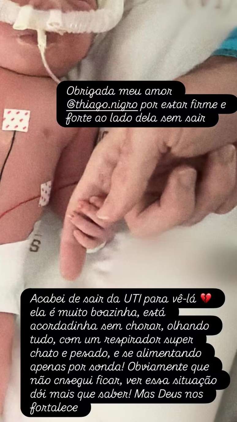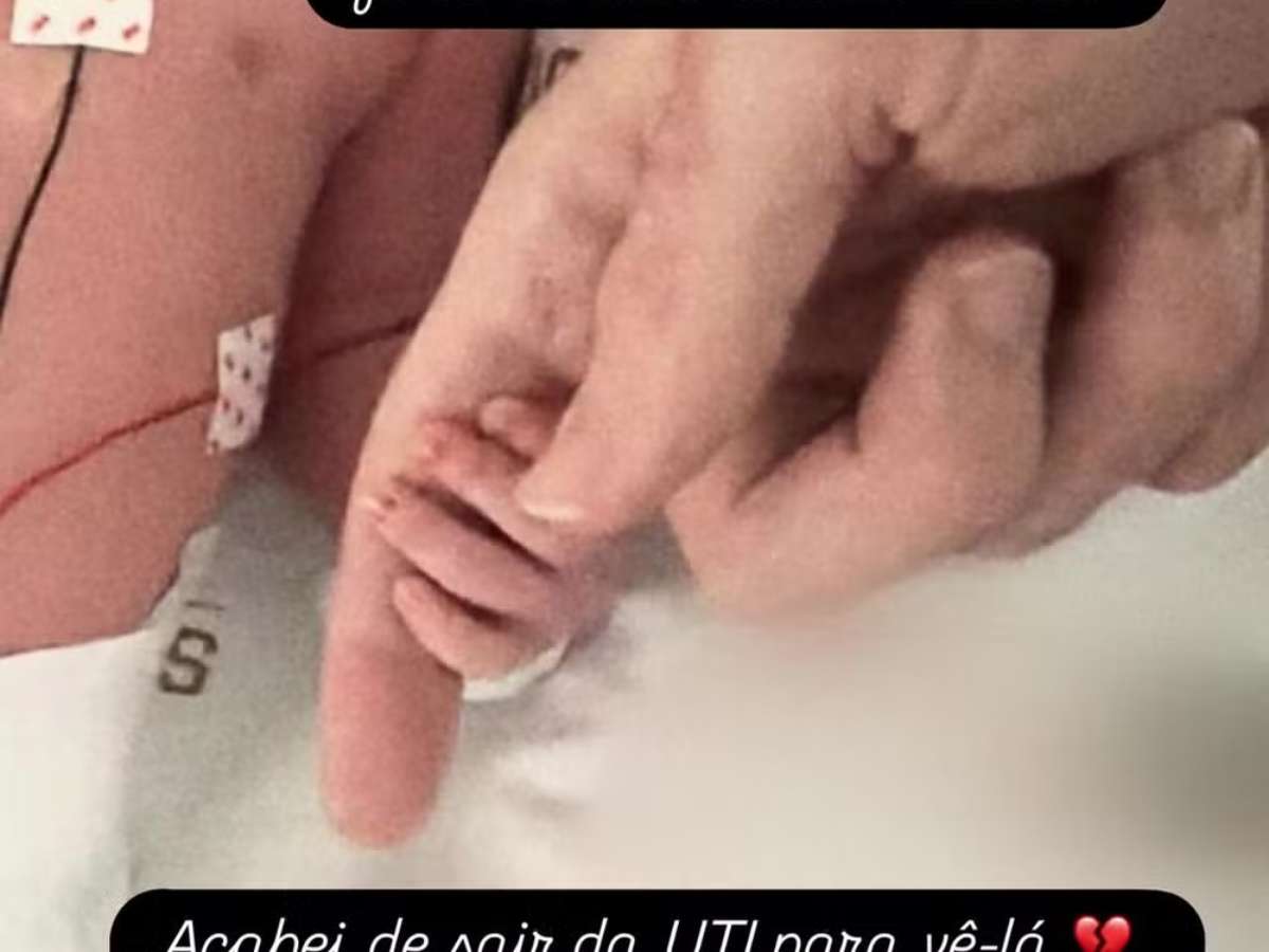 Nos Stories do Instagram, Maíra postou uma foto em que Eloáh aparece segurando o dedo do pai, o empresário Thiago Nigro, conhecido como Primo Rico. "Obrigada, meu amor, por estar firme e forte ao lado dela sem sair", escreveu. Em seguida, detalhou a experiência: "Ela é muito boazinha, está acordadinha sem chorar, olhando tudo, com um respirar super chato e pesado e se alimentando apenas por sonda. Obviamente que não consegui ficar, ver essa situação dói mais que saber [dela]! Mas Deus nos fortalece."