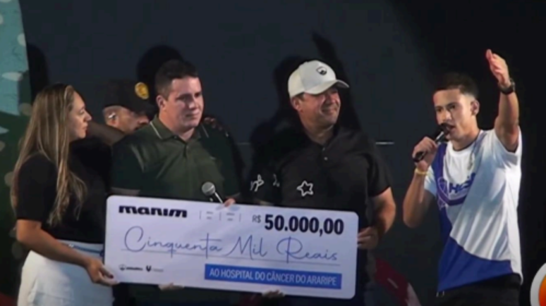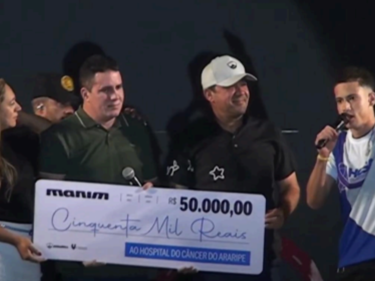 Na madrugada deste sábado (28), durante seu show no São João de Araripina, em Pernambuco, o cantor Manim Vaqueiro emocionou o público ao anunciar uma doação de R$ 50 mil ao Hospital do Câncer da cidade. Diante da plateia e da própria mãe, o artista relembrou com emoção as origens humildes em Ipubi. "A gente comia rapadura com farinha, e hoje a gente tá doando 50 mil reais pro Hospital do Câncer de Araripina. Se for pra ganhar dinheiro, que seja pra fazer o bem e ajudar a galera", declarou.